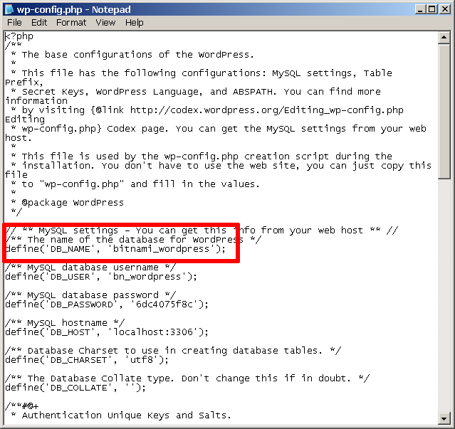 You should now update your application’s configuration and point it to your newly-created database. For example, with the Bitnami WordPress module, you will need to edit the wp-config.php file in the apps\wordpress\htdocs\ subdirectory of your XAMPP installation directory. Within this file, you will need to update the DB_NAME constant to use the new database name.